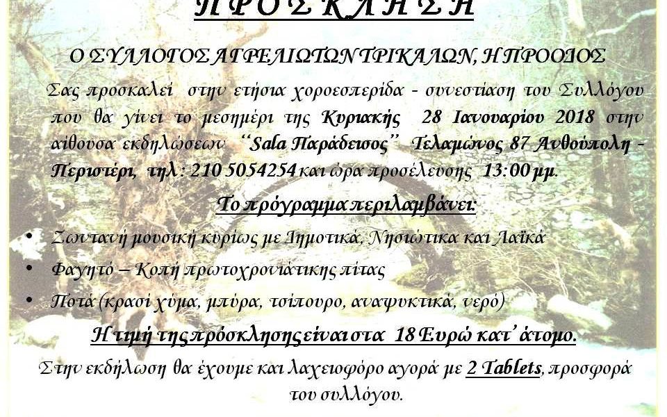 Σας προσκαλούμε να παρευρεθείτε στην ετήσια χοροεσπερίδα – συνεστίαση του Συλλόγου που θα γίνει το μεσημέρι της Κυριακής  28 Ιανουαρίου 2018 στην αίθουσα εκδηλώσεων  ‘‘Sala Παράδεισος’’  Τελαμώνος 87 Ανθούπολη – Περιστέρι,  τηλ : 210 5054254 και ώρα προσέλευσης  13:00 μμ.